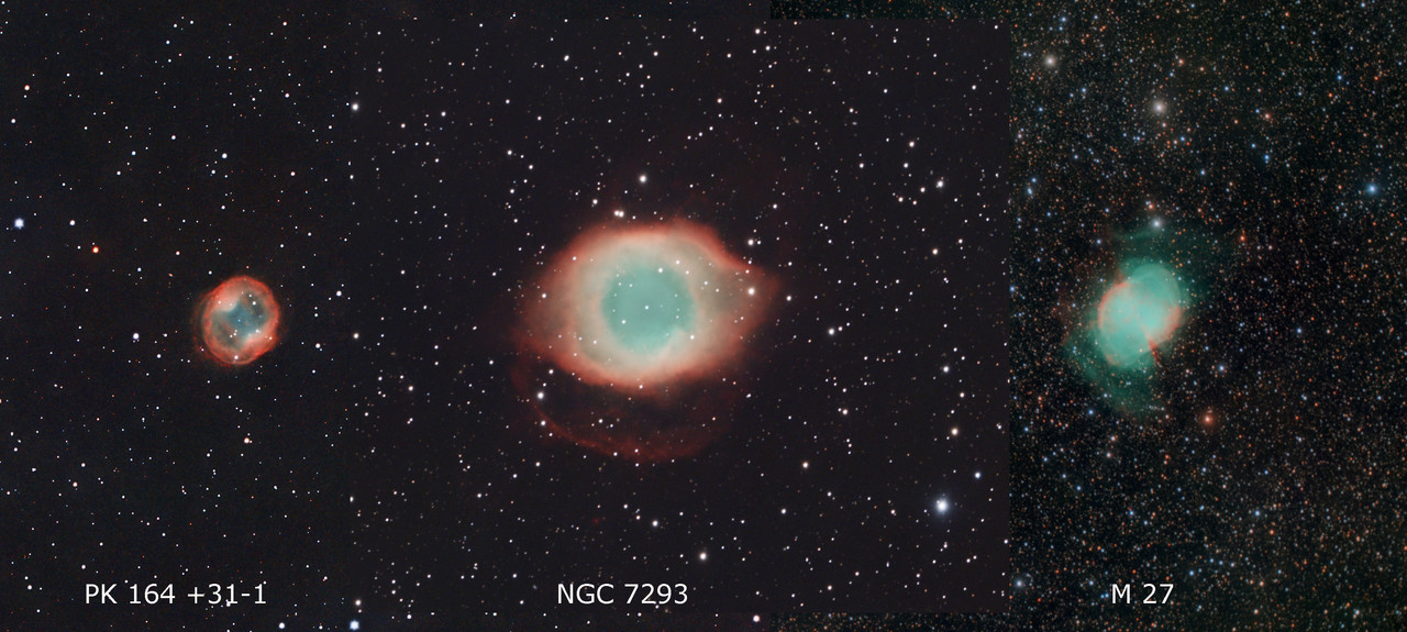 He hecho una pequeña composición comparativa de esta nebulosa planetaria con otras nebulosas mas conocidas como la nebulosa de la Hélice o la nebulosa de Dumbell