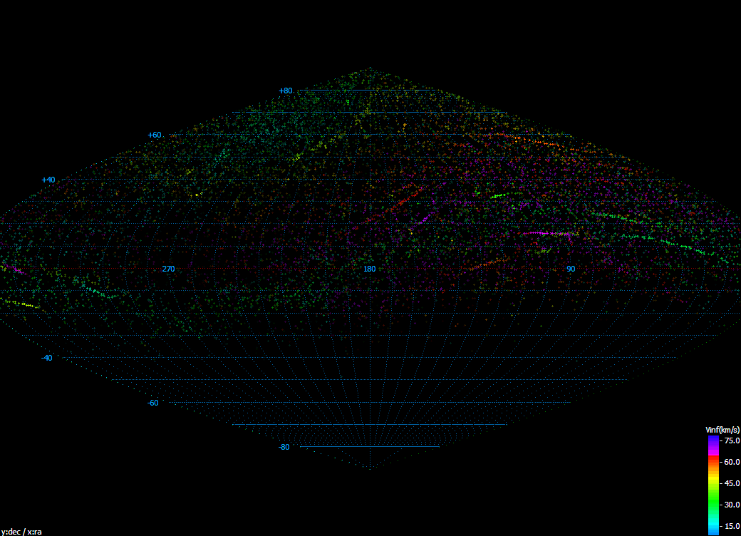 Cada punto representa una radiante hecha de entre 10 y 10 mil meteoros.