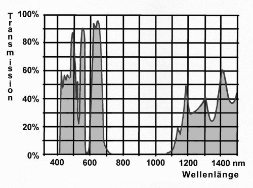 Esa gráfica de tu filtro no muestra el IR, justo se corta en los 700nm que es donde empieza le espectro IR así que es difícil saber hasta donde corta o no el IR. Aunque si seguimos la curva que se ve hasta los 700nm, parece que hay un buen trozo del IR que seguro no corta.